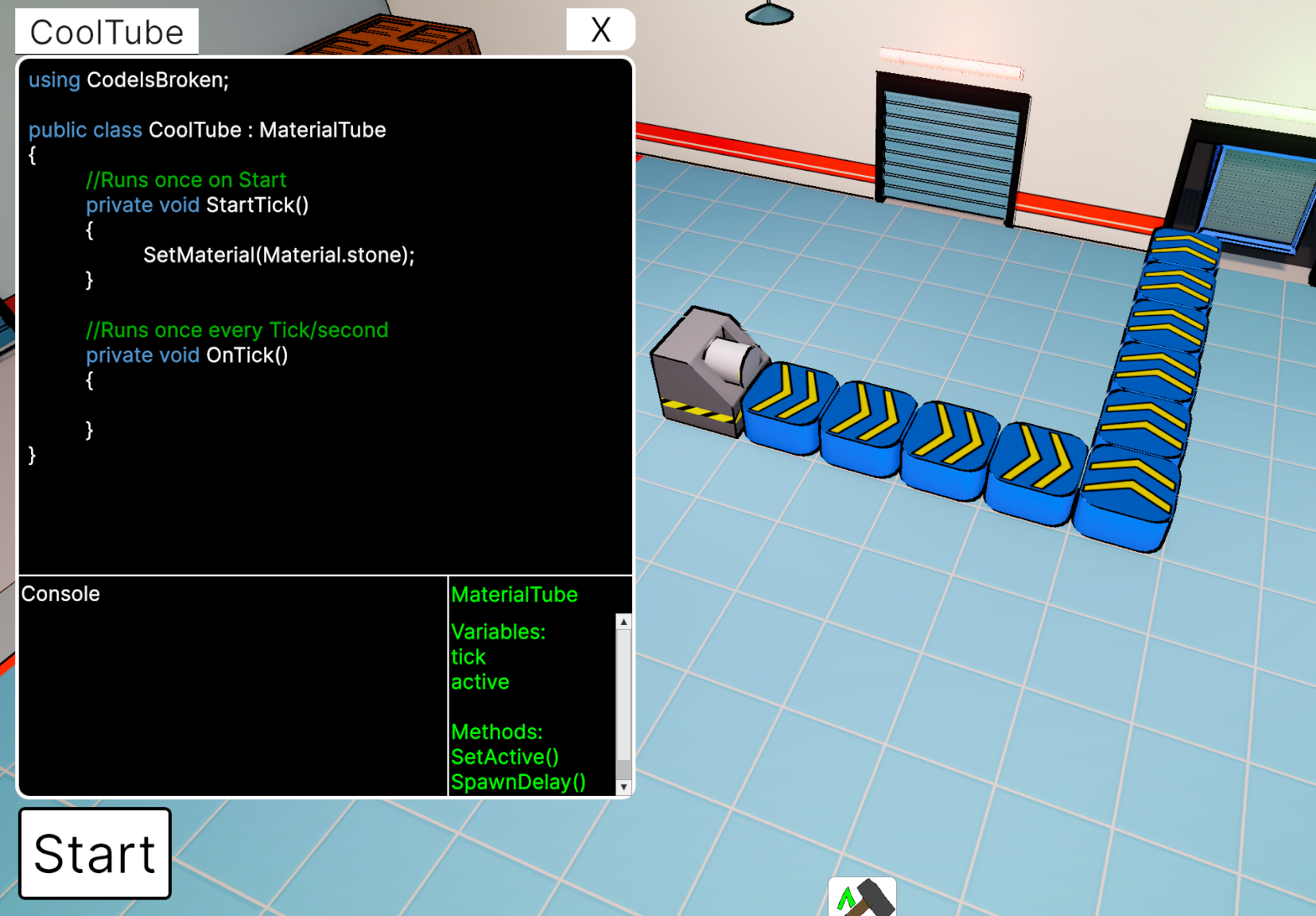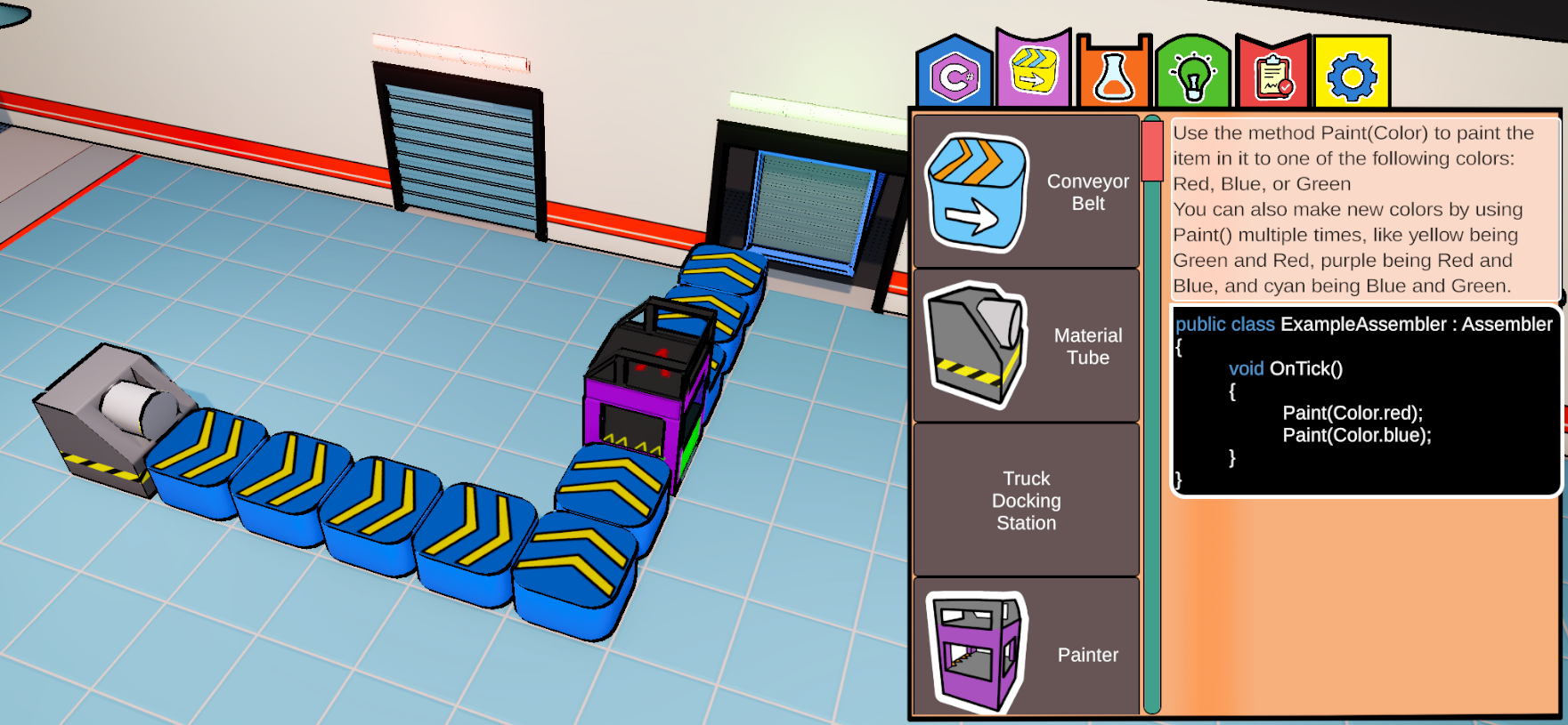 Create your own factory and build machines to deliver items! Write code to operate the machines and fulfill the contract requirements to unlock even more machines.